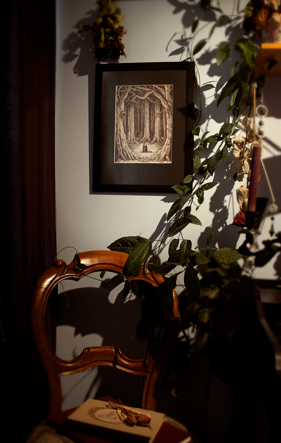Selfmade print of my drawing "Paranoia" originally done with pencils, ink pen and red watercolor. Printed in its original size with a UV-printer on high quality matte photo paper. Inspired by Brothers Grimms fairytale Little Red Riding Hood.
