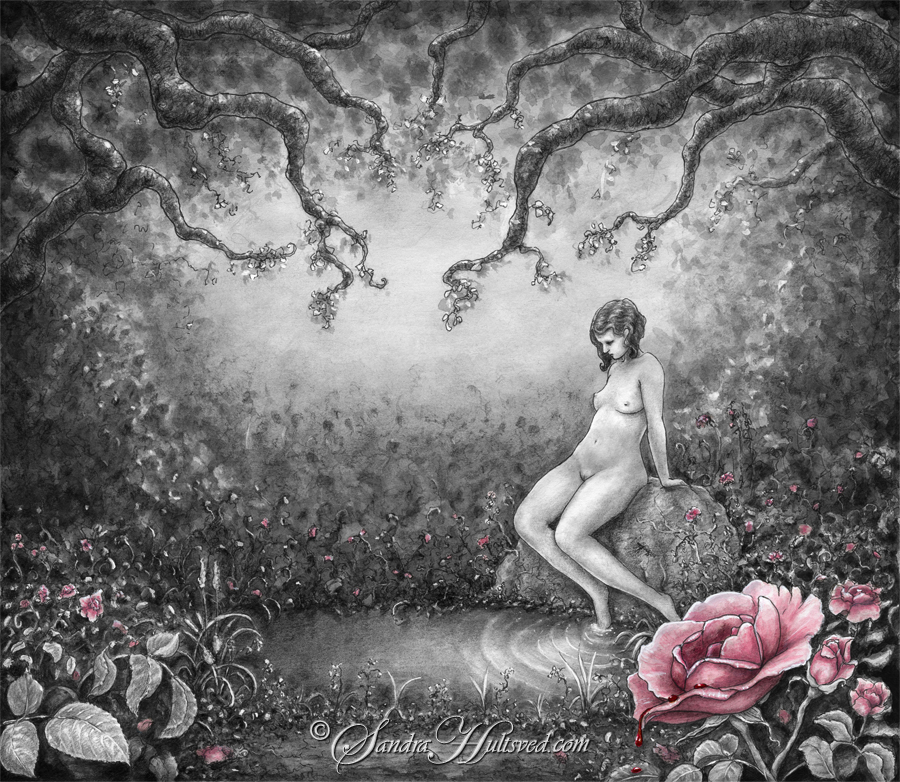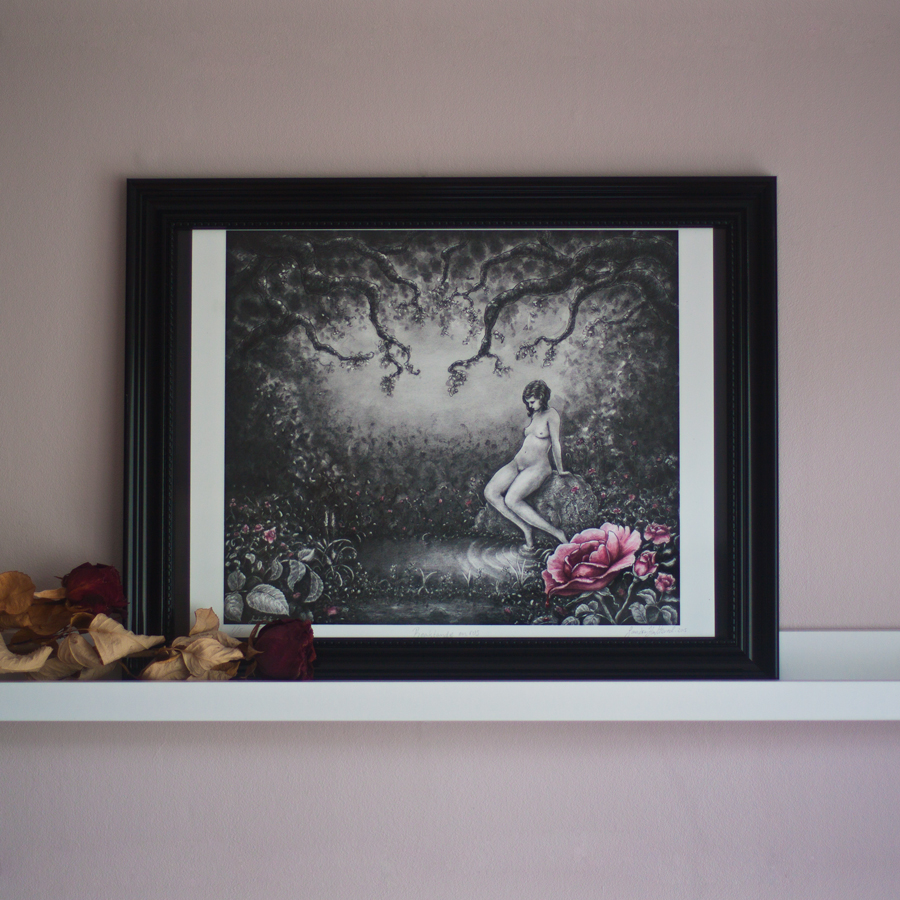 This is a beautiful Giclée print of my drawing "Beaktande en ros" printed in its original size. The original artwork was done with graphite pencils, ink and blood. This limited edition print is printed on natural white matte archival paper using archival inks.