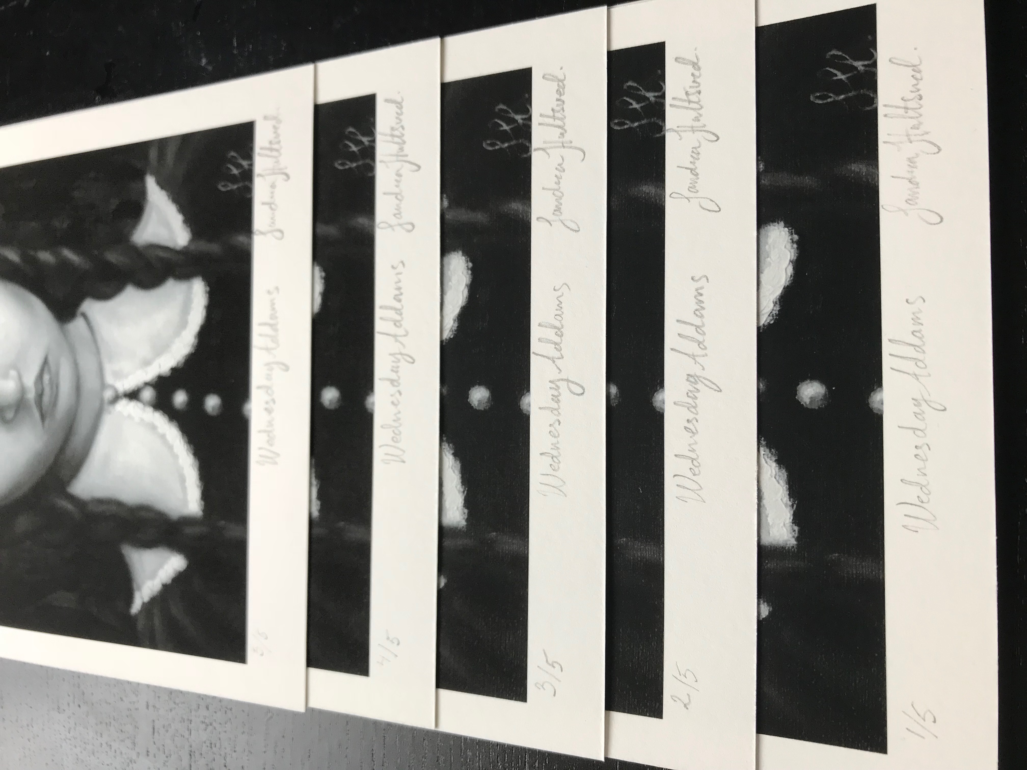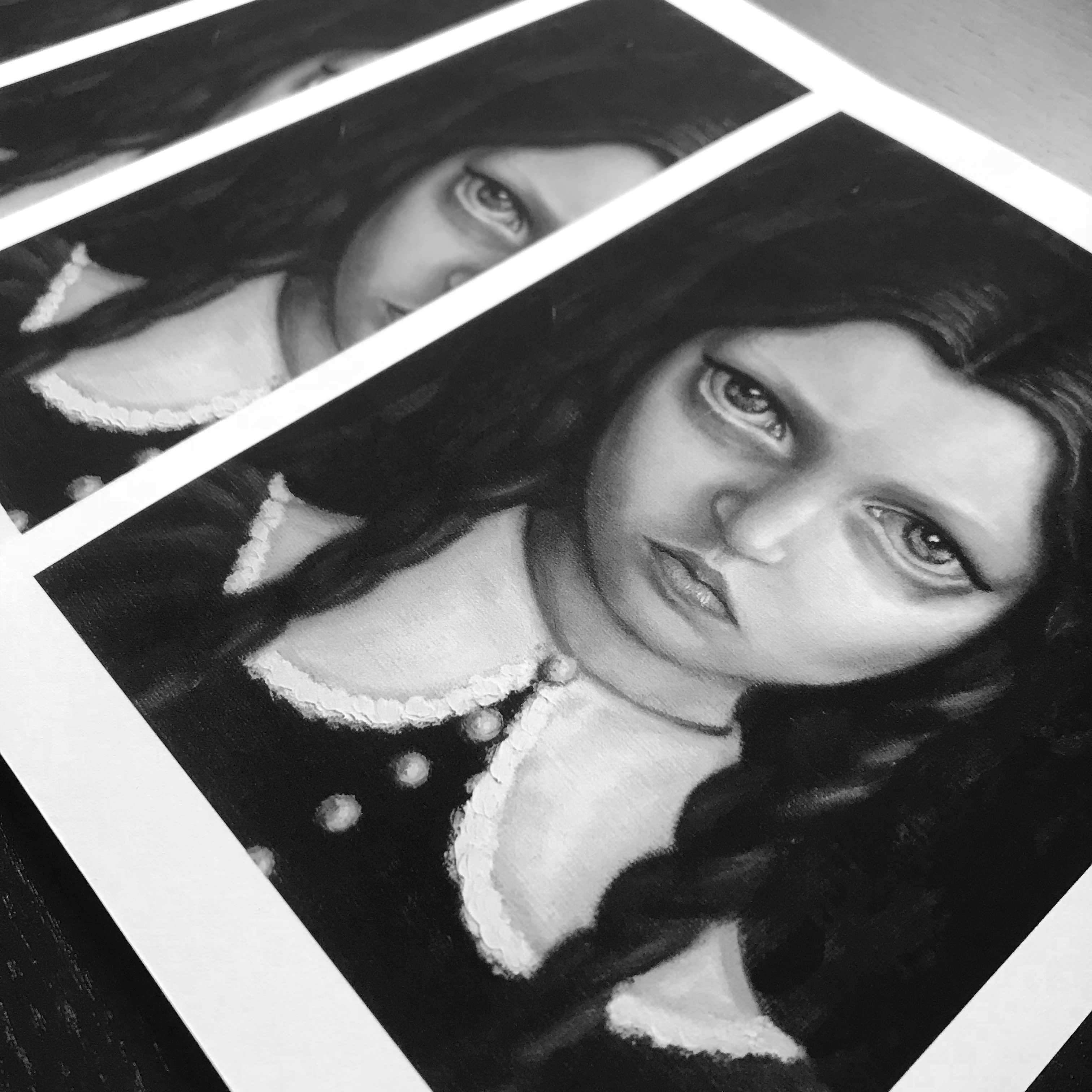 Hauntingly beautiful Giclée print of my painting "Wednesday Addams ” originally done with oils. Printed on high quality fine art paper.